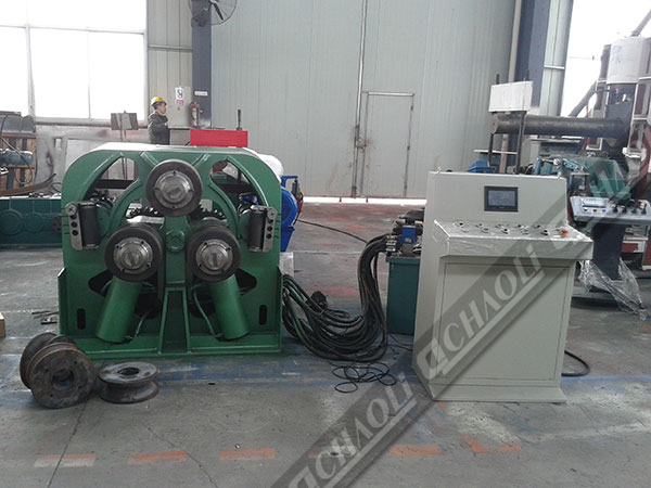 此設備為較為先進(jìn)型材彎曲設備,可做立式或臥式使用。更換模具可卷制各種型材及彎曲盤(pán)管。三輥均為主動(dòng)輥,通過(guò)液壓馬達—齒輪傳動(dòng)。設備有PLC 數控控制,帶矯正導向輥裝置,兩個(gè)側輥可圍繞固定回轉中心做弧線(xiàn)升降運動(dòng)。